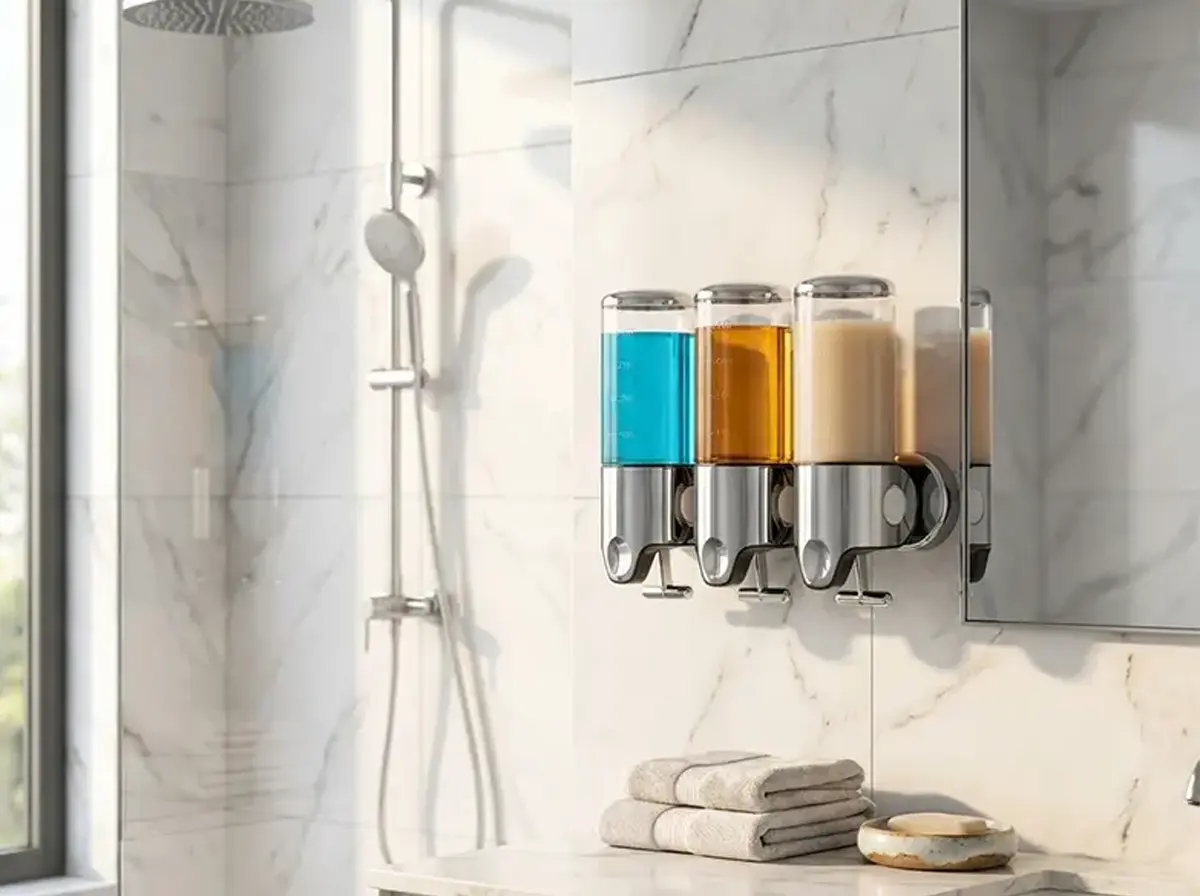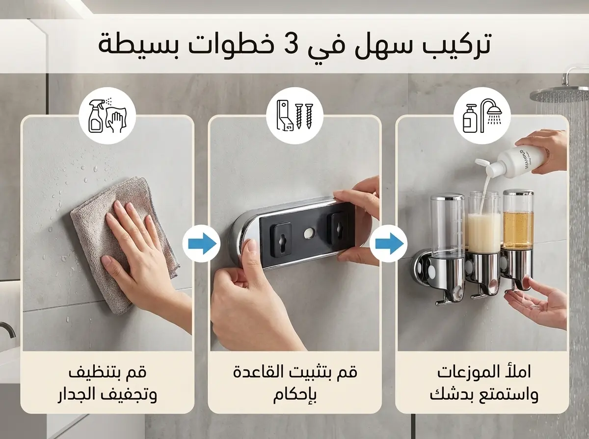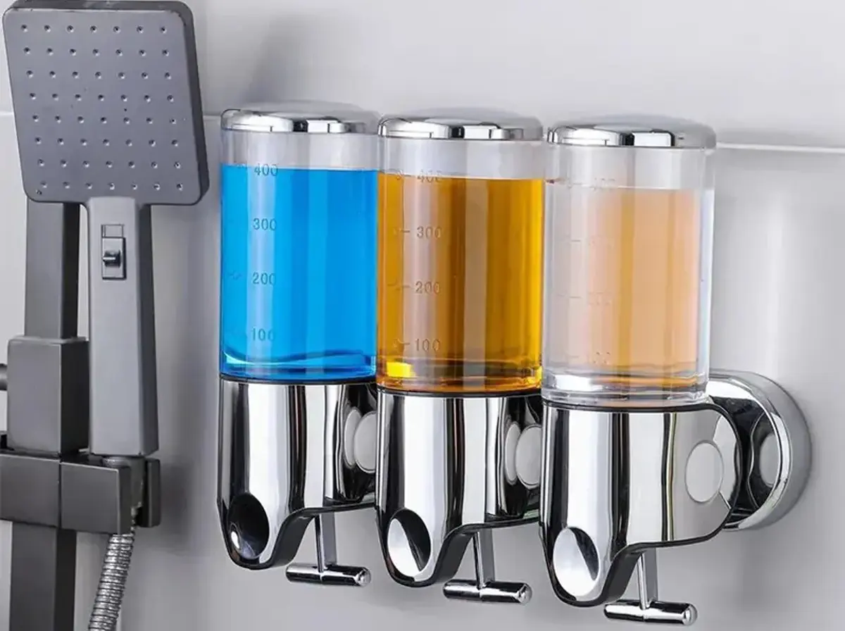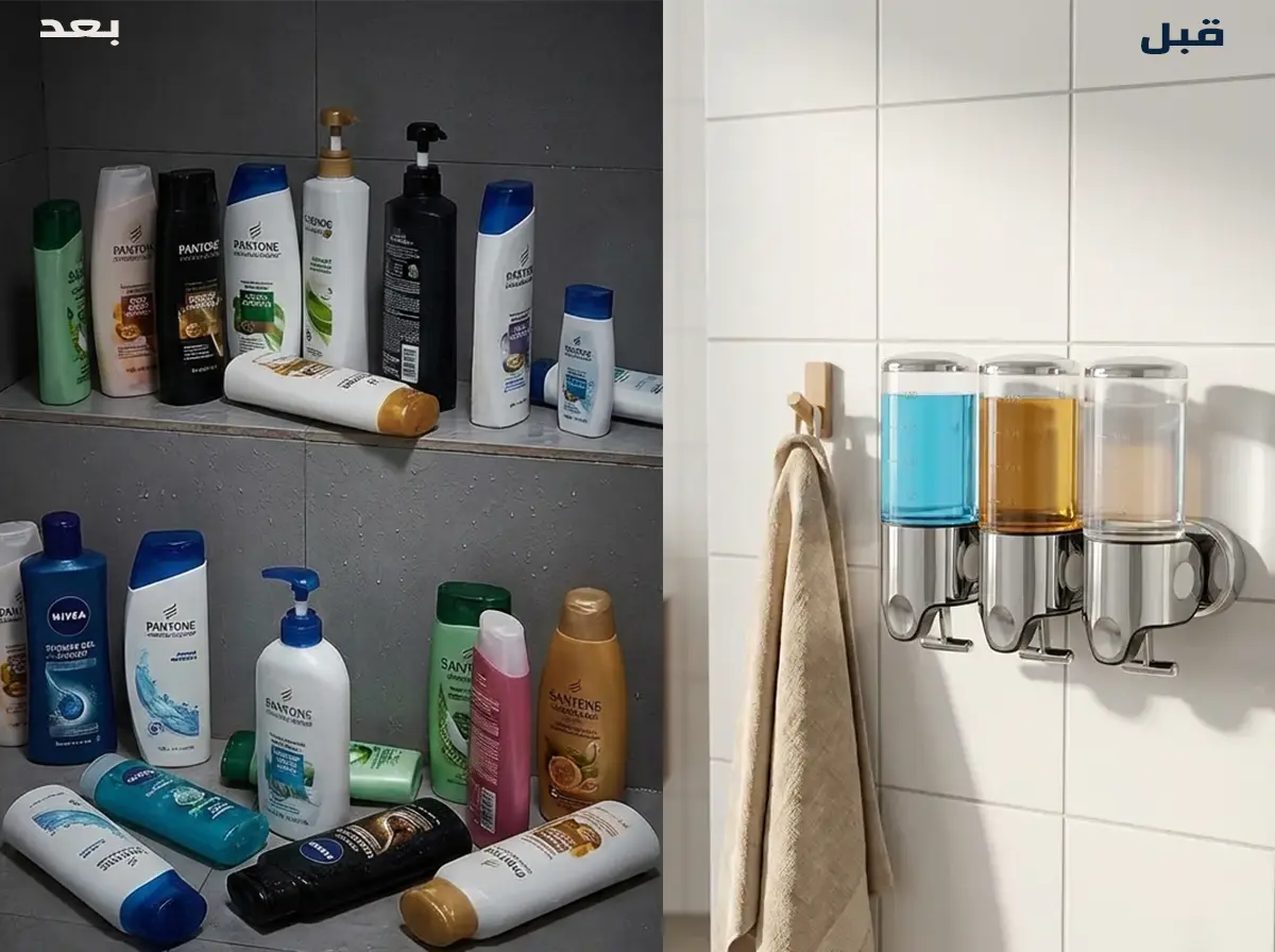 هل تعاني من تراكم عبوات الشامبو والصابون التي تفسد مظهر حمامك وتأخذ مساحة كبيرة؟ نقدم لك موزع السوائل الجداري الثلاثي، الحل العملي والأنيق الذي يجمع بين الترتيب، الفخامة، والاقتصاد. تصميم عصري يمنح حمامك لمسة رقي لا مثيل لها.
